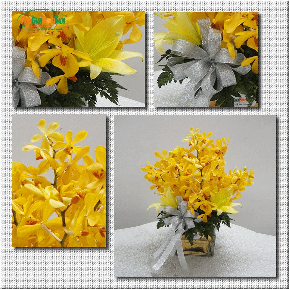 Thành phần hoa: 2 Lily vàng, 6 Lan mokara vàng, 1 Bình thủy tinh